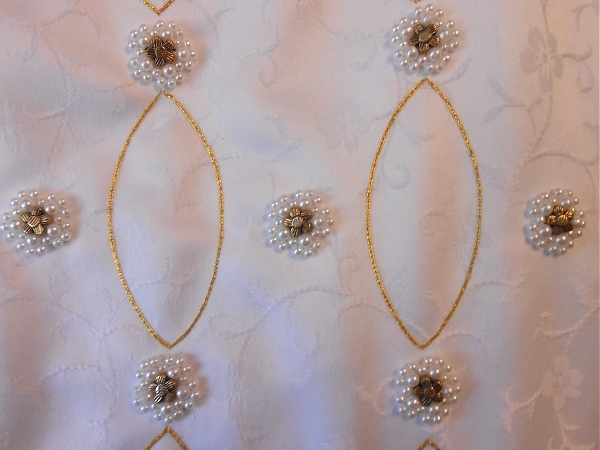 I stitched the pearl “flowers” using a metal 5 petalled flower bead, and then surrounded it with two sizes of pearls. In all there are 142 embroidered gold petals, and 261 pearl flowers.
