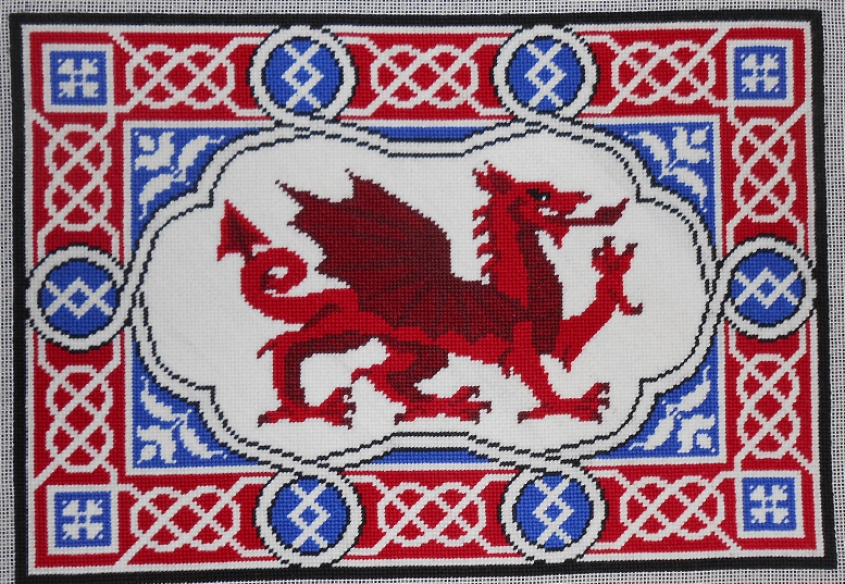 This needlepoint tapestry is to be one of a pair of a kneeling cushions for the Canton (now Shire) of Abertridwr. The final style of the cushion is not yet decided, so just the needlework has been done at this stage.