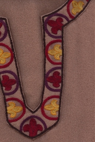 This is worked with Appleton’s wool on felted woollen fabric. It comprises a neck piece for a keyhole neckline, and bands for the sleeves and hem.