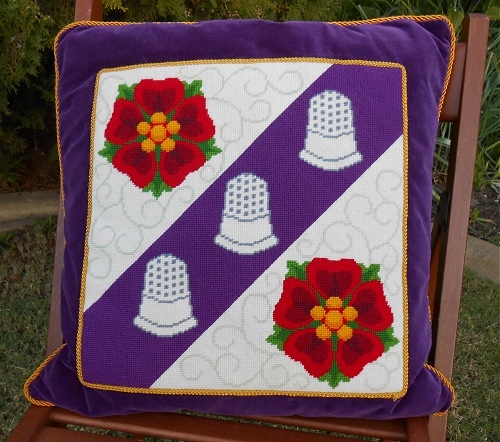 This cushion is worked in contentintal stitch with basket weave back. I used DMC Tapisserie wool with 14 count canvas. The wool was a tight fit on that canvas, but it made a firm, dense and durable cushion.
