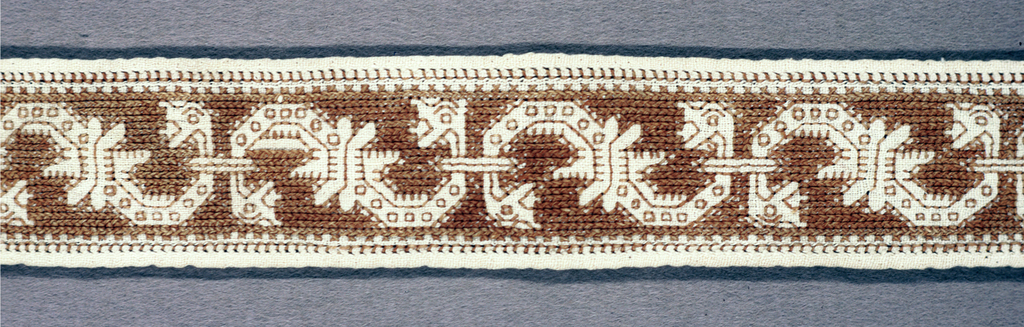 Embroidered in silk thread on linen in Italian cross and double running stitches. It is worked in monochrome red silk so that the pattern is left reserved in the colour of the linen, i.e. only the ground is worked, and the stitch is pulled tight so that it resembles punch work.